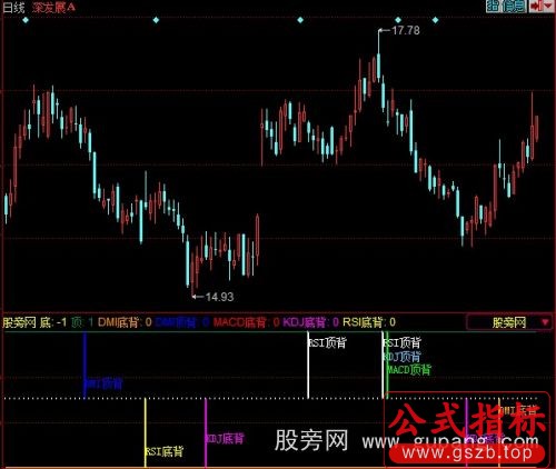 同花顺MACD+KDJ+RSI+DMI顶底背离指标公式
