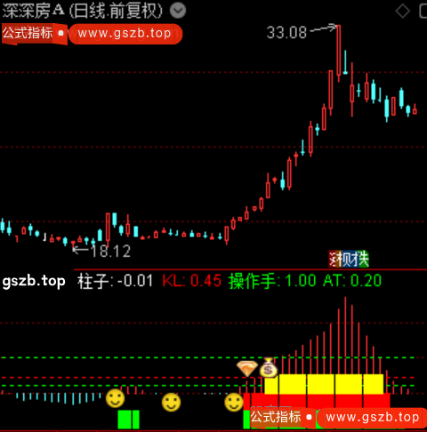 {指标介绍: 双线系统:红色做多线(VAR1与VAR2的较大值)与绿色做空线(VAR2与VAR1的较大值)形成交叉参考,红色线上穿黄色操作线时触发做多信号,绿色线下穿AT线时提示做...