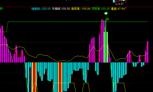 用法说明:黄色为立桩量,绿色长竖条为逃顶提示,蓝色与红箭头为突破,红色为牛,紫色为立桩三天法则成立,笑脸为寻底,棕色与绿箭头为破位,淡红色黑中线涨停,深绿色黑中线跌停,∠为...